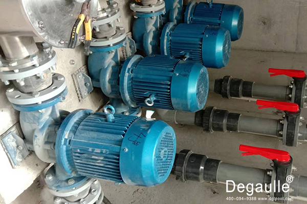 在泳池水循環方面,配備4臺5.5KW循環水泵,其中一臺備用,循環水泵的循環流量:49m3/h;揚程:21M;總循環流量:146m3/h。不銹鋼毛發收集器4臺,其中一臺備用。