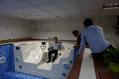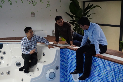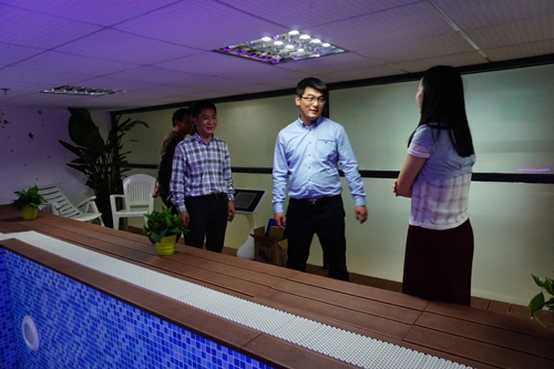 薛正浩老師在我們曹總的帶領下參觀我的展廳及我們研發設計的新產品——戴高樂可拆式活動圍板泳池。