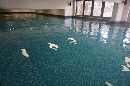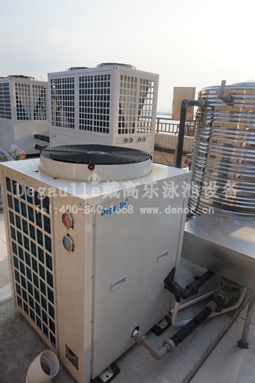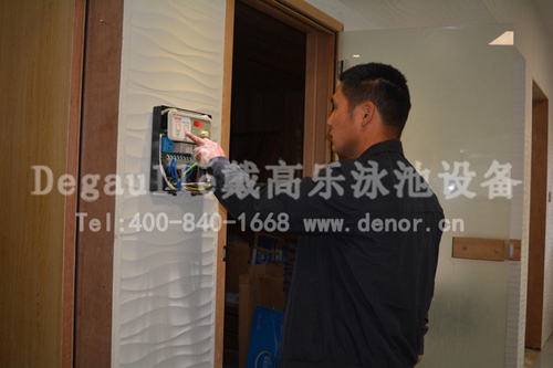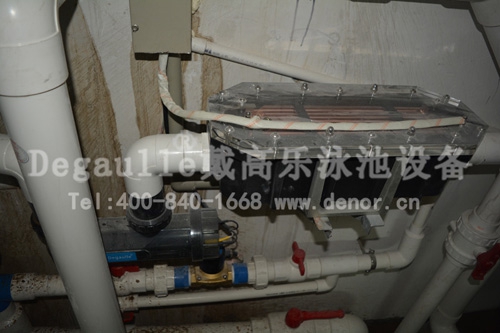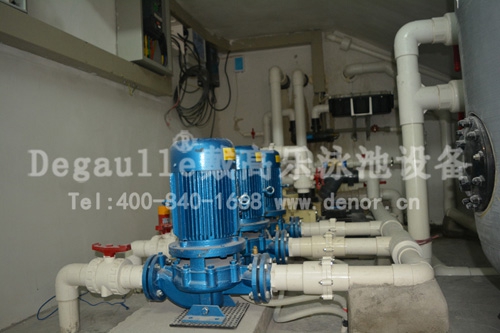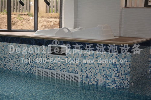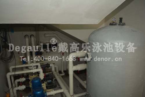 水療池泳池工程容積為4m3,泳池循環過濾設備使用的是戴高樂DS400 8m3/h玻璃纖維砂缸(側出式),1.5HP/220V循環水泵2臺,恒溫泳池設備使用的是戴高樂5HP/380V泳池恒溫熱泵。